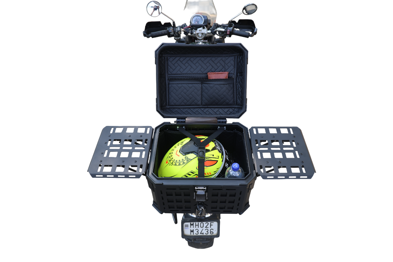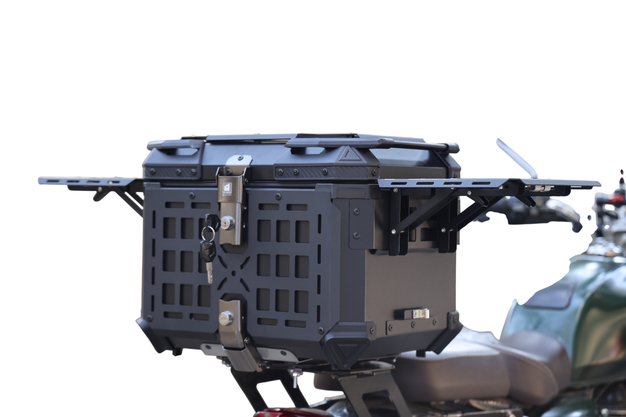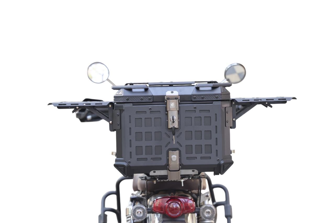 The MH 45L Motorcycle Top Box is designed for motorcycle riders who need durable, spacious, and secure storage. Made from high-quality aluminum alloy, this top box offers a 45L storage capacity for safely carrying your essentials on the go. The quick-release stainless steel chassis ensures easy installation and removal, while the dual wing side tables provide additional space for small items, making this top box both practical and convenient.